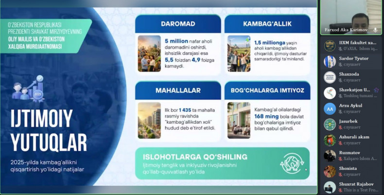 Ma’ruza davomida Prezidentimizning Oliy Majlis va xalqimizga yo‘llagan navbatdagi Murojaatnomasi mamlakatimizning so‘nggi yillarda bosib o‘tgan taraqqiyot yo‘lini chuqur tahlil qilish, erishilgan natijalarni baholash va kelgusida amalga oshirilishi lozim bo‘lgan ustuvor vazifalarni belgilab berishi bilan alohida ahamiyat kasb etishi ta’kidlandi.