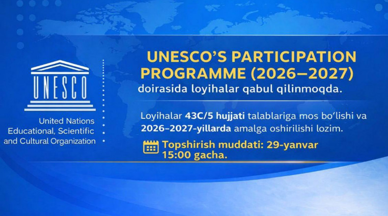UNESCO tashkiloti tomonidan 2026-2027-yillar uchun UNESCO’s Participation Programme (Qatnashuv dasturi) doirasida moliyalashtiriladigan loyihalar bo‘yicha arizalar qabuli boshlanganligi ma’lum qilinadi.