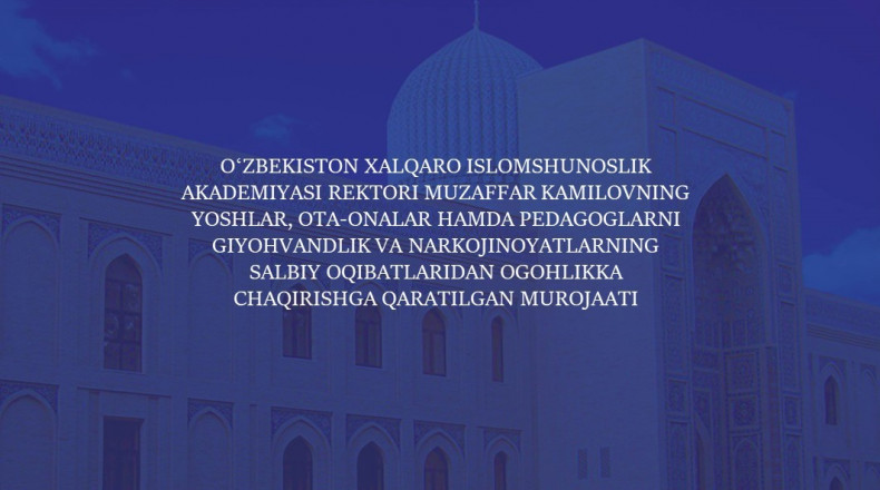 Oʻzbekiston xalqaro islomshunoslik akademiyasi rektori Muzaffar Kamilovning yoshlar, ota-onalar hamda pedagoglarni giyohvandlik va narkojinoyatlarning salbiy oqibatlaridan ogohlikka chaqirishga qaratilgan MUROJAATI